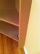 We had to be really careful bringing this in from the saw in the garage. The holes in the front really make it a bit fragile! We attached it with some finishing nails into the top, bottom, and middle shelves.