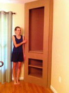 Here we are test fitting my front frame size. Because nothing is ever perfectly square or straight in our house, we had some creative cutting to do, but everything lined up pretty well when we were done. Once that was all established we could cut the holes in the front face frame for the cabinet on the bottom and the opening for the shelves on top.